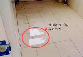 水水水,這條又是由于睡引起的!衛(wèi)生間的地面鋪設(shè)沒有考慮坡度,沒有把穩(wěn)水的流向,導(dǎo)致地漏不是全體衛(wèi)生間的最低點(diǎn),水往外流,泡了客廳的地板。