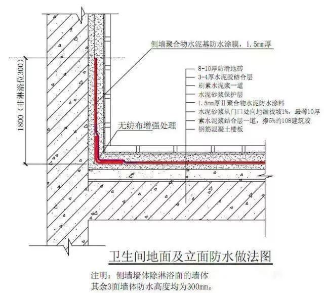 注重防水涂刷的位置和高度。地面;一般墻體上翻涂刷30㎝高;淋浴區(qū)周圍墻體上翻涂刷180㎝高或至墻頂位置;有浴缸的位置上翻涂刷比浴缸高30㎝。