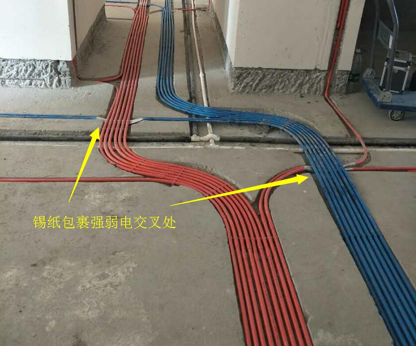 3、強(qiáng)弱電交叉處需要用錫紙包裹,這樣不但可以避免相互之間產(chǎn)生干擾導(dǎo)致信號(hào)不良的情況,而且對(duì)線管交叉處起到保護(hù)作用,減輕磨損。