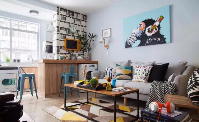 可愛浮夸的背景墻掛畫十分吸睛,可以看出業(yè)主是一個天馬行空十分有趣的人。
