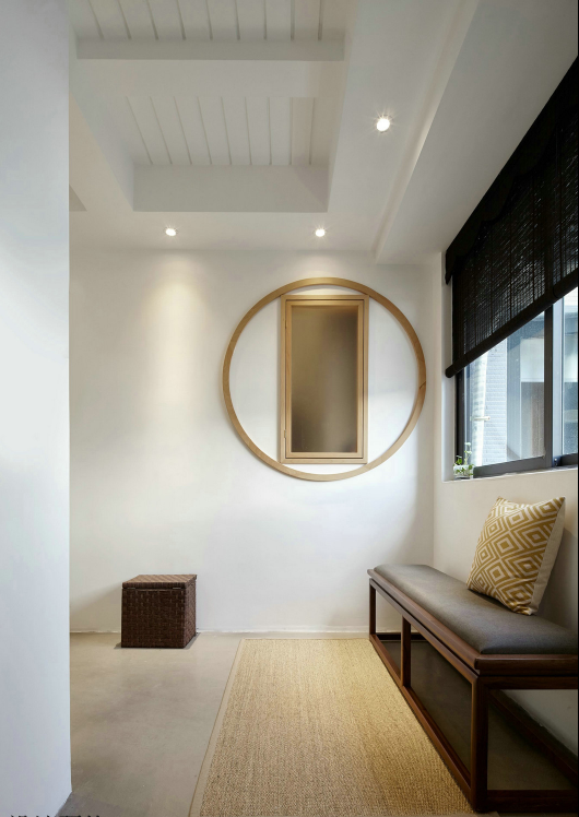 入戶處形成一個玄關(guān),保證業(yè)主生活的私密。廚房設(shè)置在與玄關(guān)相鄰的位置,廚房的墻上設(shè)置了一個方形窗,用于采光和實現(xiàn)視覺上的通透感,方形窗的另一面,玄關(guān)處則使用了圓形框套方窗的方式,將中式建筑中的園林趣味帶入空間,解決了開窗問題,也在入戶時造景。將一樓原有的格局進(jìn)行改動。>