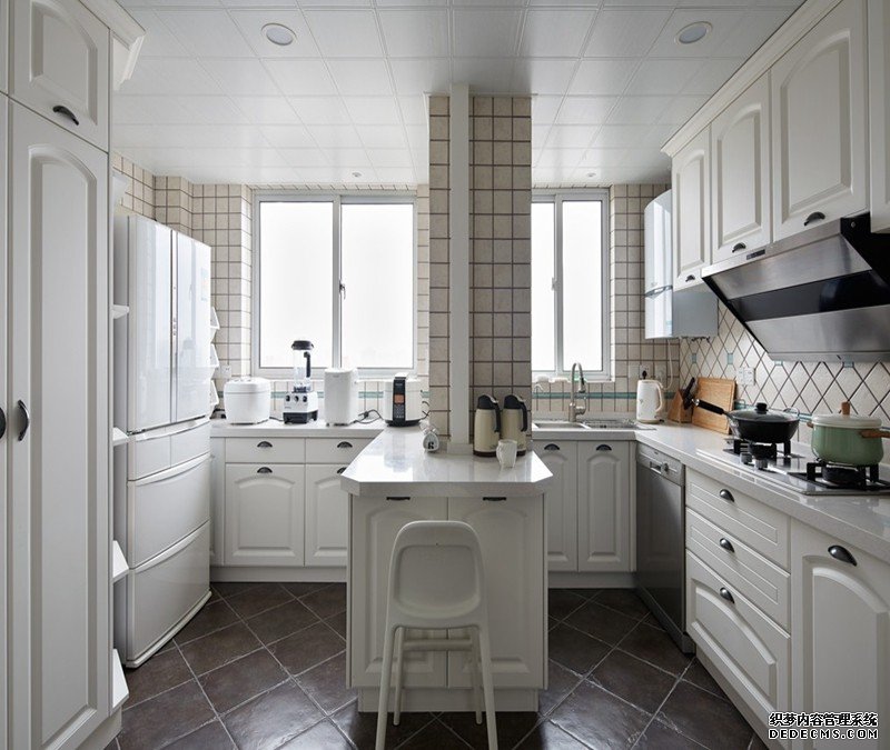 廚房空間:開放性的廚房,充滿懷舊感的墻磚,凸顯著美式風(fēng)格自由,富有歷史氣息的鮮明個性。與廚房設(shè)計(jì)色彩相一致的休閑小吧臺,既是廚房的延伸又是廚房與外部空間的分界線,空間格局鮮明。