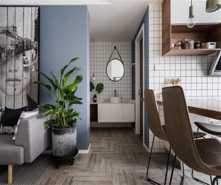進門走廊處,做了線框內(nèi)嵌處理,拉寬過道的視覺感