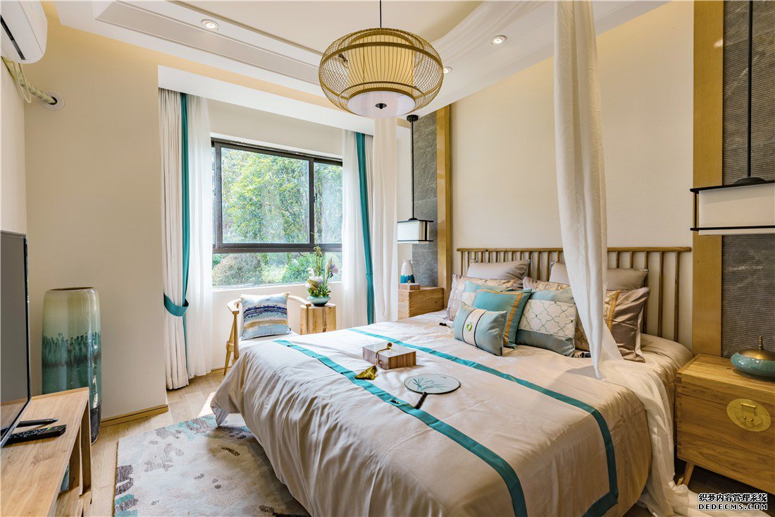 主臥帶有一個(gè)小陽臺(tái),合理的空間劃分與雅致的中式家具一起營造空間的浪漫氛圍。次臥的色調(diào)較為素雅,簡潔干凈的空間氛圍可以營造良好的睡眠環(huán)境。