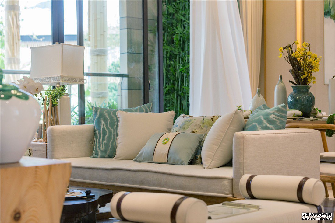 舒適的沙發(fā)上通過不同顏色的抱枕來營造視覺層次。